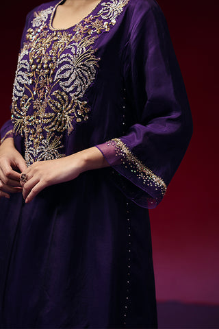 Featuring a violet colour salwar set with intricate hand embroidered yoke.