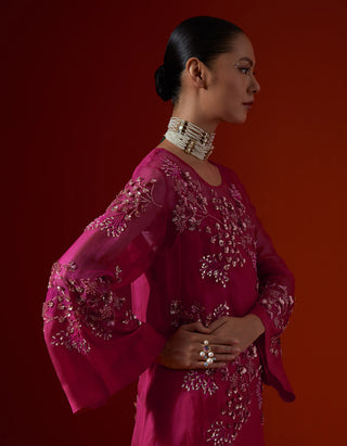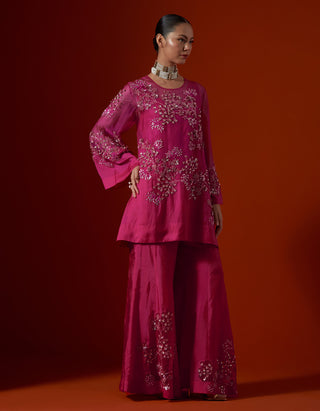 Featuring a hot pink sharara set with floral cluster embroidery.