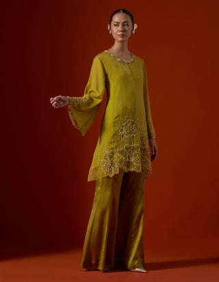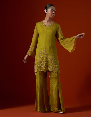 Featuring a henna colour sharara set with sequined floral embroidery.