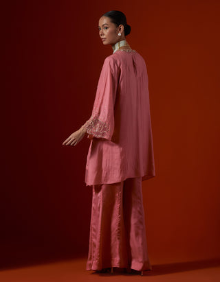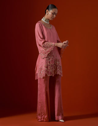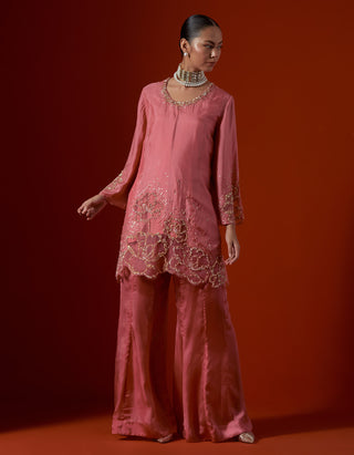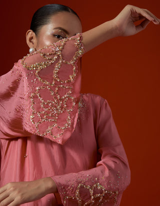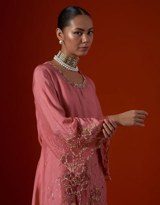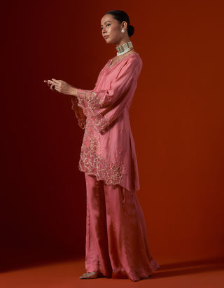 Featuring a salmon colour sharara set with sequined floral embroidery.