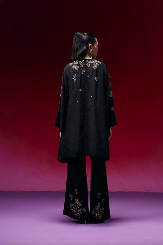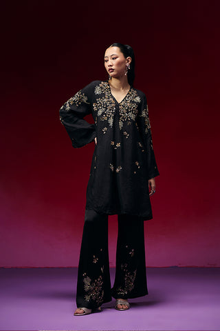 Featuring a black co-ord set with floral clusters embroidery.
