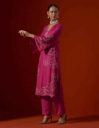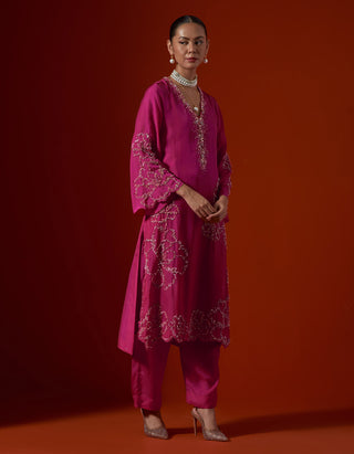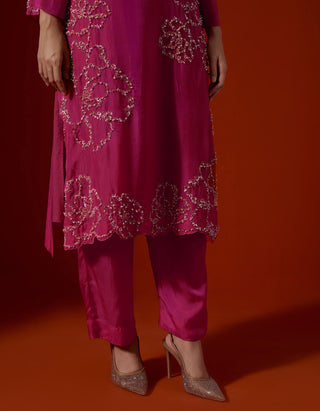 Featuring a hot pink silk kurta set with encrusted floral embroidery.