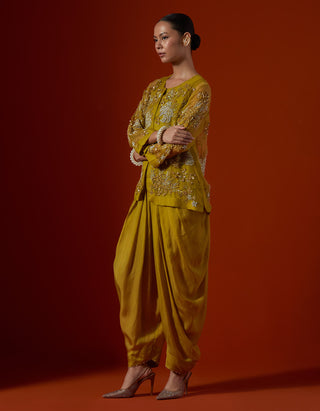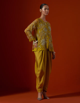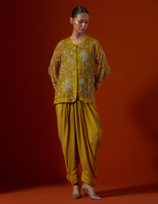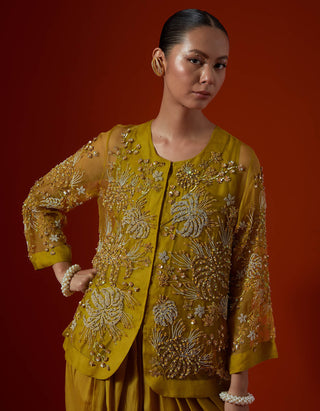 Featuring a henna organza jacket set with intricate floral hand embroidery.