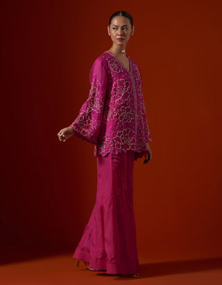 Featuring a hot pink organza jacket set with intricate floral hand embroidery.