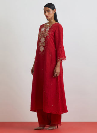 Featuring a ruby crushed silk kurta set with embellished yoke