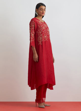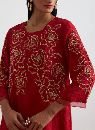 Featuring a ruby crushed silk kurta set with embellished floral pattern
