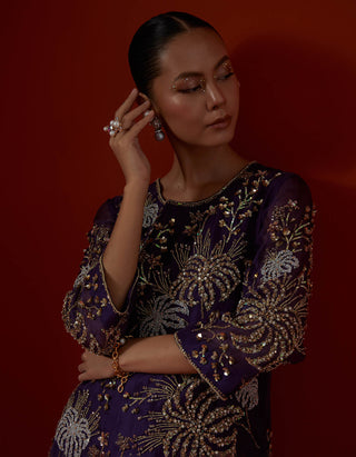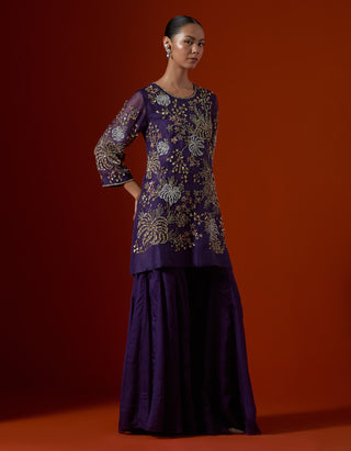 Featuring a violet sharara set with intricate floral hand embroidery.