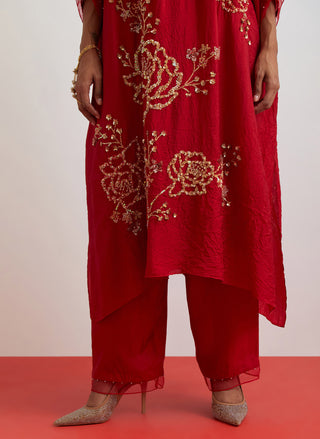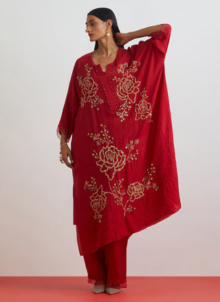 Featuring a ruby crushed silk kaftan set with hand embroidered roses pattern