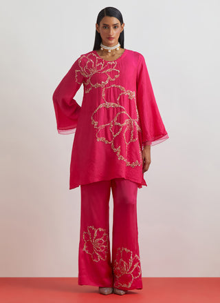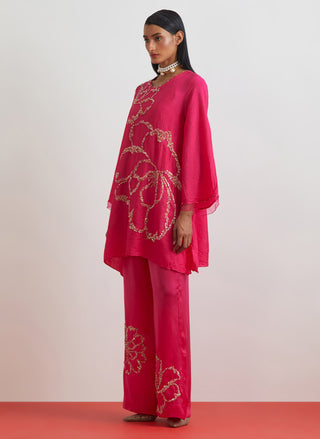Featuring a hot pink crushed silk co-ord set with bold floral motif
