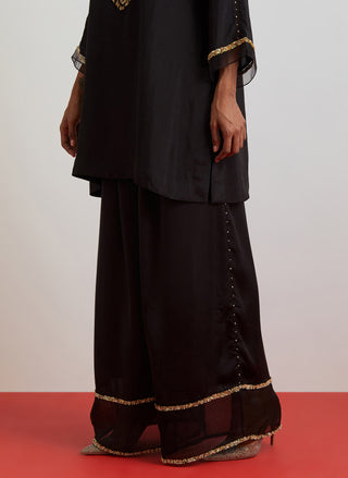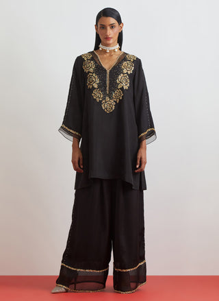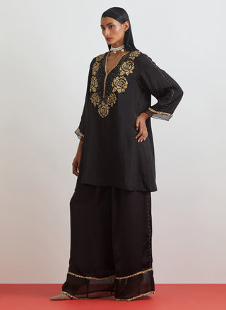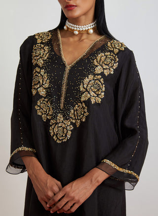Featuring a black silk short Kurta Set with rose garland embroidery