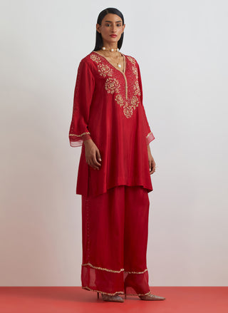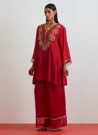 Featuring a ruby silk short Kurta Set with rose garland embroidery