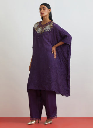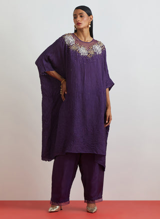 Featuring a violet crushed silk kaftan set with floral hand embroidery