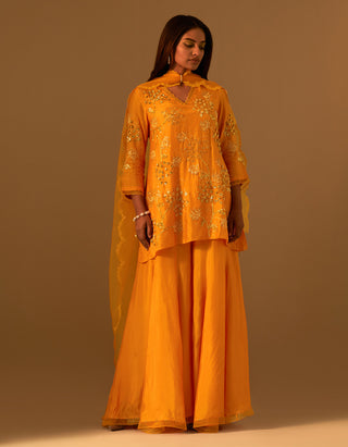 Featuring a tangerine organza dupatta with floral thread embroidery border