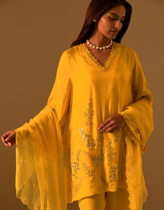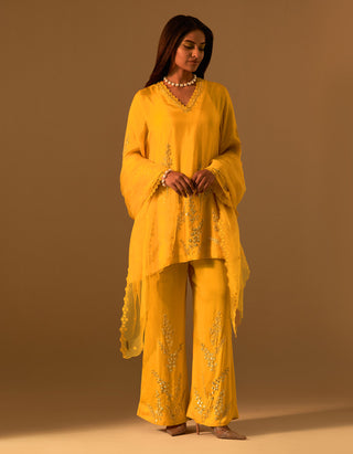 Featuring a saffron organza dupatta with embroidered edges