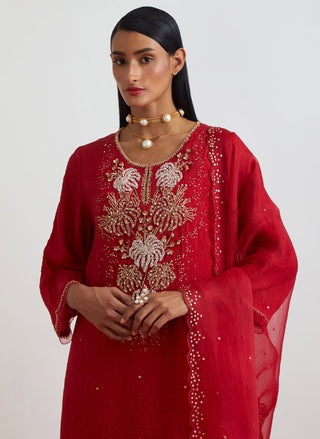 Featuring a ruby silk organza dupatta with sequined edges