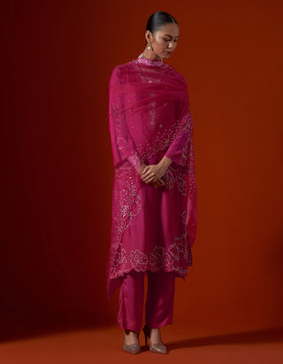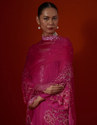 Featuring a hot pink organza dupatta with scalloped edges and sequins spray.