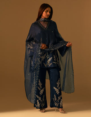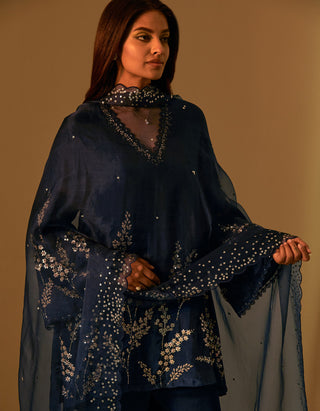 Featuring a navy organza dupatta with scalloped edges and sequins spray