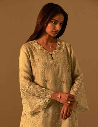 Featuring a shell sharara set with floral thread work