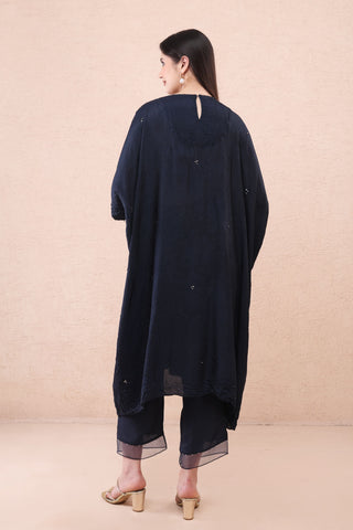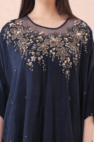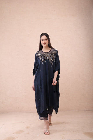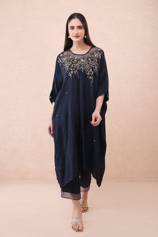 Featuring a navy crushed silk kaftan set with floral hand embroidery